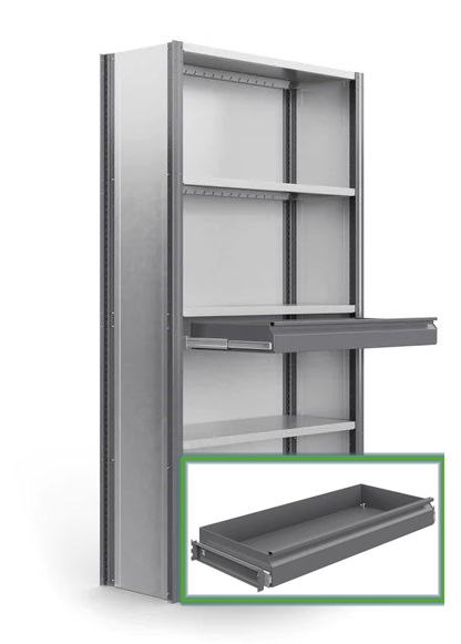 Utdragslåda till EAB hyllställ komplett med fästen.